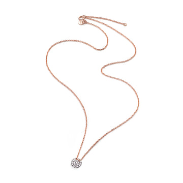 Collana girocollo della collezione Burato Paillettes da donna. Colore: oro rosa. Il gioiello è realizzato in oro rosé 750‰ (18kt) ed è composto da un ciondolo passante di diametro ø 6 mm impreziosito da un pavé di diamanti con caratura totale di 0,09 - colore F - purezza VVS. La lunghezza è regolabile da 40 cm a 42 cm con chiusura a moschettone.